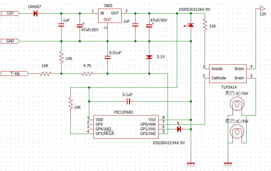 実はウィンカー類はLEDに換装しており時定数を考えるのが面倒だと考えたのと、電子回路の勉強のためである。以前、PICを使いリレーを追加した回路を提示していたが、費用が削減できるためフォトリレーに変更している。図にある5VLEDはテスト用なので実際は必要無い。