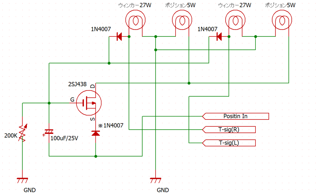 もっと簡略化したい人は、Pch-MOSFET(2SJ438)を使った「ウィンカー優先回路」なるものがちまたには出回っているようです。2SJ438などは、マイナスコントロール信号からプラスコントロール信号への出力変換にも使われていて、要はメカニカルリレーの代わりにMOSFETを使ったものです。こちらだと費用も形状サイズも小さくなるのでバイクや車への装着換装にはオススメではありますね。ただ、2SJ438などは現在入手しにくく代替品を使っているようです。