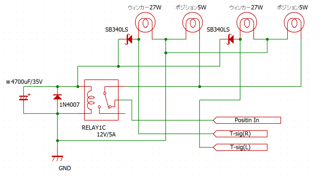 ポジションへ電源が入りポジション5Wが点灯。ウィンカースイッチが入るとリレーへ電源が供給されポジション回路が切断されてポジション5Wが消灯となる。電解コンデンサでウィンカー消灯時のリレー状態保存とポジション復帰タイミングを計っている。